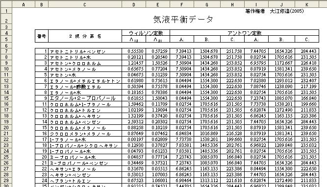 Prausnitz教授らの書で有益なデータ集として紹介されたもののExcel版 |