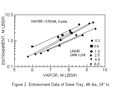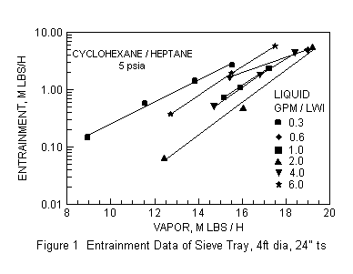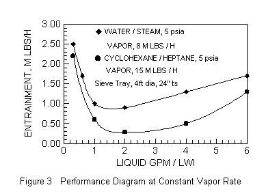 4.結果 結果をFig.1,2,3に示した.Fig.1,2より蒸気量の増加により飛沫同伴量が急激に増加する事が分かる.Fig.1,2の結果を用いて蒸気量を固定した場合の液流量による飛沫同伴量の変化をFig.3に示した.シクロヘキサン ヘプタン系および水+水蒸気系とも同じ傾向を示し,シクロヘキサン ヘプタン系では液流量約2GPM/LWIにおいて,水+水蒸気系では液流量約1.5GPM/LWIにおいて飛沫同伴量は最小値を示している. |