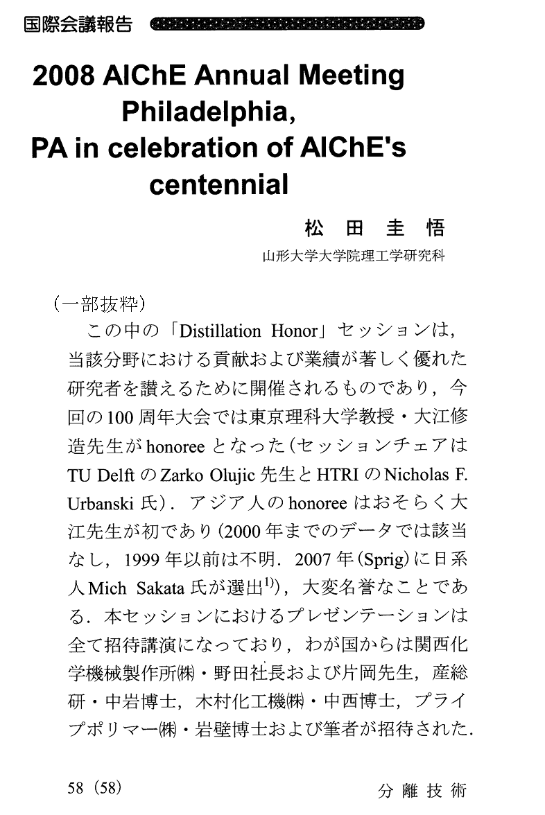 First I want to say “Thank you very much to the chairs of these sessions of Distillation Honors I and II, Dr. Nicholas Urbanski and Dr. Zarko Olujic”. And I am grateful to Dr. Urbanski and Dr. Olujic for selecting me as an honoree of the AIChE separation division. This is a great pleasure for me as well as Japanese presenters. The presenters and I are proud of the distillation honors. We are very happy to be celebrated at this centinel meeting of the AIChE. Whenever I join the meeting, I feel the warmness and pride. I think this comes from your long history. We want to learn these characteristics of the AIChE as Japanese members. This is a meeting of AIChE and is not JIChE. However, 6 presenters out of a total of 10 members are Japanese. I also want to thank the presenters from America, Europe, as well as Japan. I have enjoyed each of the subjects presented here today. And I have also been touched by the personal stories and anecdotes. Concerning this point, I, again want to acknowledge to both of the chairs, and hope that today’s sessions may encourage more Japanese members to join AIChE. I thank all of the members very much for gathering here today. And last finally I thank Nobuko, my wife. 最初に本蒸留表彰セッションTおよびUの座長でありますニコラス・アーバンスキー氏とザルコ・オルジック氏にお礼を申し上げたいと思います.また,AIChEの分離技術部門で表彰して頂きましたことについて感謝致します.これは私のみ成らずご出席の日本の会員に取りまして,大変光栄なことであります. AIChEの100周年記念大会に表彰されましたことも極めて幸せなことであります.私がAIChEの年会に参加していつも思いますことは,暖かさとプライドを感じることです.これはAIChEの長い歴史によるものと思います.我々日本の会員もAIChEのこの特質を学びたく思います. この年会はAIChEでありJIChE(日本の化学工学会の意)ではありません.しかし,講演者10人中6人が日本の会員であります.私は日本のみならずアメリカ,ヨーロッパ,メキシコからの講演者の方々にも感謝申し上げます.この点につきましても両座長に改めて御礼申し上げます.本セッションでのご講演を楽しませて頂きました.また,私に関するお話や逸話にも感激致しました.本日のセッションが日本の会員に励みとなり,日本の会員がより多く参加されることを希望します. 本日,ここにお集まりの総ての皆様にお礼を申し上げます.最後に,私の妻,伸子に感謝して終わりとします. |