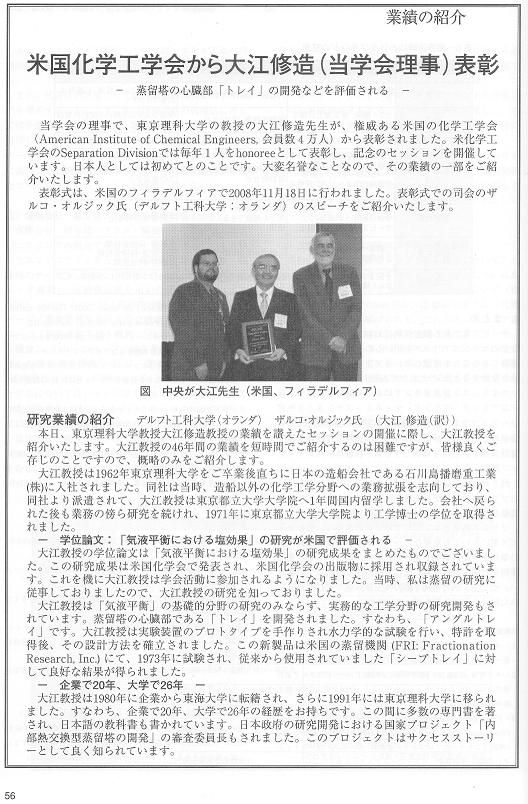 座長 デルフト工科大学(オランダ) ザルコ・オルジック氏 本日、東京理科大学教授大江修造教授の業績を讃えたセッションの開催に際し、大江教授を紹介いたします。大江教授の46年間の業績を短時間でご紹介するのは困難ですが、皆様良くご存じのことですので、概略のみをご紹介します。 大江教授は1962年東京理科大学をご卒業後直ちに日本の造船会社である石川島播磨重工業(株)に入社されました。同社は当時、造船以外の化学工学分野への業務拡張を志向しており、同社より派遣されて、大江教授は東京都立大学大学院へ1年間国内留学しました。会社へ戻られた後も業務の傍ら研究を続けれ、1971年に東京都立大学大学院より工学博士の学位を取得されました。 大江教授の学位論文は「気液平衡における塩効果」の研究成果をまとめたものでございました。この研究成果は米国化学会で発表され、米国化学会の出版物に採用され収録されています。これを機に大江教授は学会活動に参加されるようになりました。当時、私はマグネシアの蒸留に従事しておりましたので、大江教授の研究を知っておりました。 大江教授は「気液平衡」の基礎的分野の研究みならず、実務的な工学分野の研究開発もされています。蒸留塔の心臓部である「トレイ」を開発されました。すなわち、「アングルトレイ」です。大江教授は実験装置のプロトタイプを手作りされ水力学的な試験を行い、特許を取得後、その設計方法を確立されました。この新製品は米国の蒸留機関(FRI:Fractionation Research, Inc.) にて、1973年に試験され、従来から使用されていました「シーブトレイ」に対して良好な結果が得られました。 大江教授は1980年に企業から東海大学に転籍され、さらに1991年には東京理科大学に移られました。すなわち、企業で20年、大学で26年の経歴をお持ちです。この間に多数の専門書を著され、日本語の教科書も書かれています。 日本政府の研究開発における国家プロジェクト「内部熱交換型蒸留塔の開発」の審査委員長もされました。このプロジェクトはサクセスストーリーとして良く知られています。 |