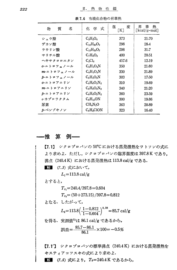 液体を加熱すると蒸発して気体となる。一方,気体を冷却すると凝縮して液体となる.すなわち,液体から気体ヘ,あるいは気体から液体へと相変化する際に,熱量の出入りがある.この熱量のことを潜熱といい,蒸発の際の熱量を蒸発潜熱と呼び,凝縮の際の熱量を凝縮潜熱と呼ぶ.相変化の際は温度変化がないので,あたかも熱の出入りがないかのようにみえるので,潜熱という。同様に,固体が融解して液体となったり,あるいは固体が昇華して気体となるときに加える熱量のことを,それぞれ融解熱および昇華熱という。 蒸発潜熱と凝縮潜熱の値は同一であるが,蒸発潜熱は加熱した場合の熟量であり,凝縮潜熱は奪った場合の熱量である.例えば,100℃の水が蒸発する際には,539cal/gの熱量を与える必要があり,100℃の水蒸気が凝縮する際には,539ca1/gの熱量を奪う必要がる。蒸発潜熱は温度および蒸気圧との間に,第4章で示したクラウジウス・クラペイロンの式,すなわち(4.6)式の関係が成立している.(4.6)式を変形すると, L/T=(V2−V1)dP/dT (7.1) となるが,理想気体の法則を適用し,液体の体積が無視できるほど小さいとき, L/T=RT/P・dP/dT (7.2) となる。したがって,蒸気圧と温度との関係からdP/dTを求めて,蒸発潜熱を計算することができる。蒸発潜熱の実測値として報告されている値の多くは,(7.2)式による計算値である.蒸発潜熱は温度の上昇に対して減少し,臨界温度でゼロとなる.各種物質の蒸発潜熱と温度との関係を図7.1に示す。いずれの物質の場合も,傾向は全く同しである。 7.3.2 蒸発潜熱の推算式 7.3.2.1 標準沸点における蒸発潜熱 沸点における蒸発潜熱をLb:ca1/g-molとし,標準沸点をTb:Kとすると,多くの物質では, Lb/Tb≒21 (7.4) となる。(7.4)式はトラウトンの法則といわれる。(7.4)式を無極性の物質について詳細に検討したキスティアコフスキの式がある. Lb/Tb=8.75+4.571logTb (7.5) 蒸気圧の関係式を用いて,標準沸点におげる蒸発潜熱を決定することができる.蒸気圧と温度の関係式を臨界点と標準沸点とに適用することにより, Lb=RTcΔzvb(Tbr’lnPc/(1−Tbr)) (7.6) が得られる.Rは気体定数であり,Tcは臨界温度K,Tbrは沸点の対臨界温度[−]である.Δzvbは沸点におげる圧縮係数で,1とおいてよい.(7.6)式はギアカロン式と呼ばれる。この式の精度を上げた式として,リーデル式がある. Lb=1.093RTc[Tbr(lnPc−1)/(0.930ーTbr)] (7.7) この式の精度は極めてよい. 7.3.2.2 蒸気圧データによる蒸発潜熱の推算 蒸発潜熱を求める温度における蒸気圧がわかっている場合は,ヒルデブランドの法則を佐藤が蒸発潜熱に適用した次式がある. 無極性液体の場合: L/T=23.61(P/T)−0.119 (7.8) 極性液体の場合: L/T=27.98(P/T)−0.105 (7.9) 【7.1’】シクロプロパンの標準沸点(240.4K)におげる蒸発潜熱をキスティアコフスキの式により求めよ. |
